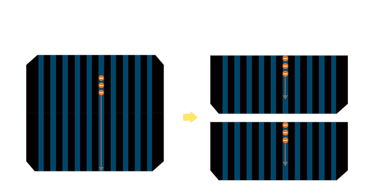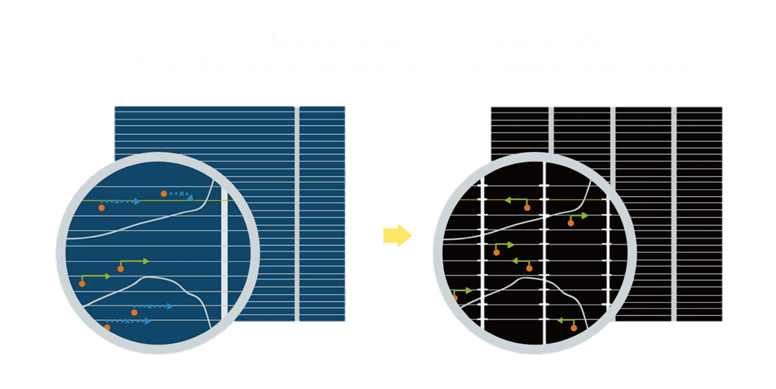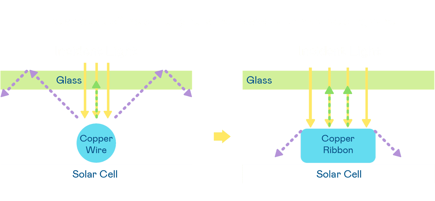 • 电池使用多条铜导线 (Copper wire) 于电池片上形成较短的电流路径,,,提高电流收集效率,,,,采用圆形设计的铜导线较传统扁平式的铜焊带 (Ribbon),,,可增加入射至电池的光线量。。。