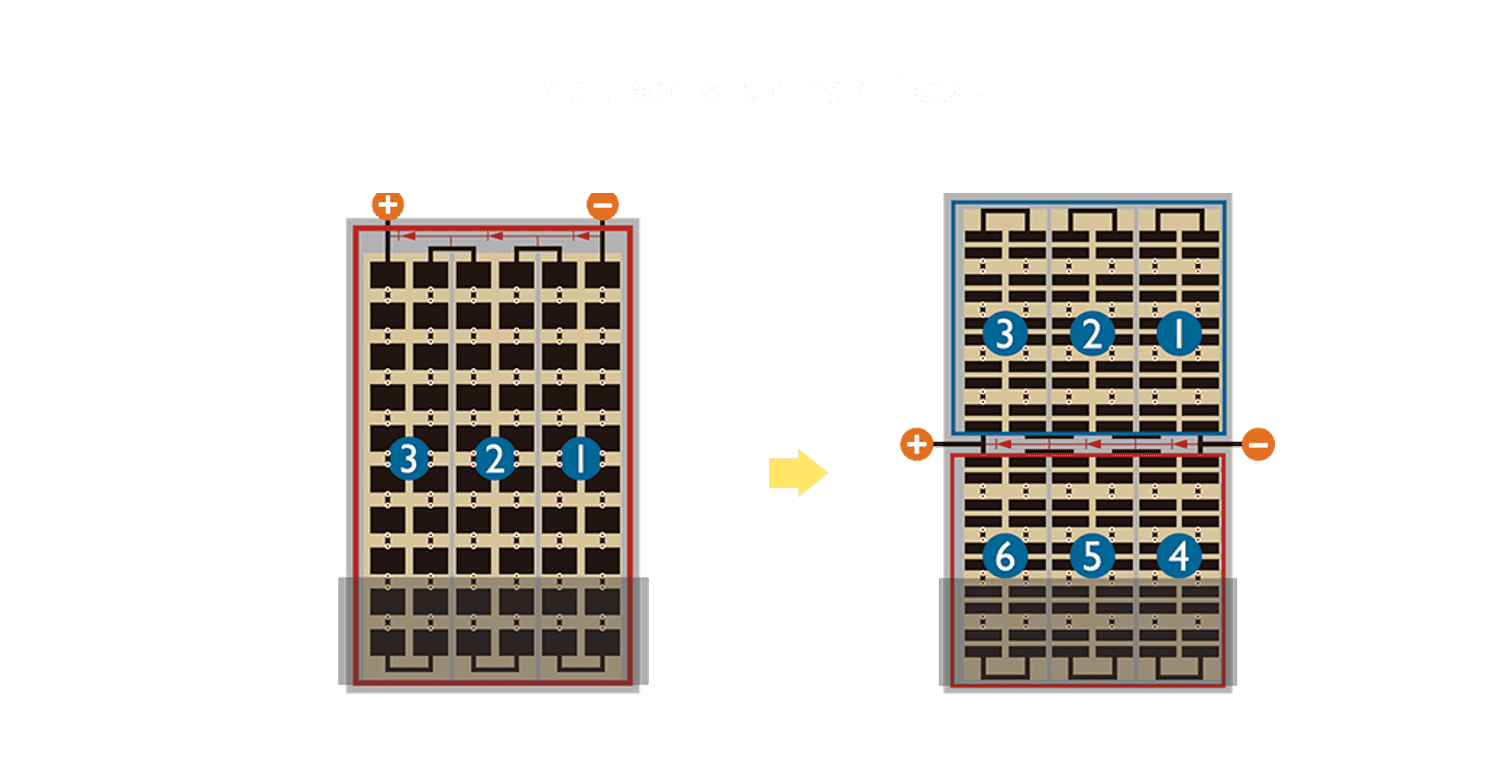 • 结合半切电池,,,,降低遮阴影响、、、提升模组抗隐裂能力、、、、并减少电阻损耗,,进一步提升模组发电效能。。
