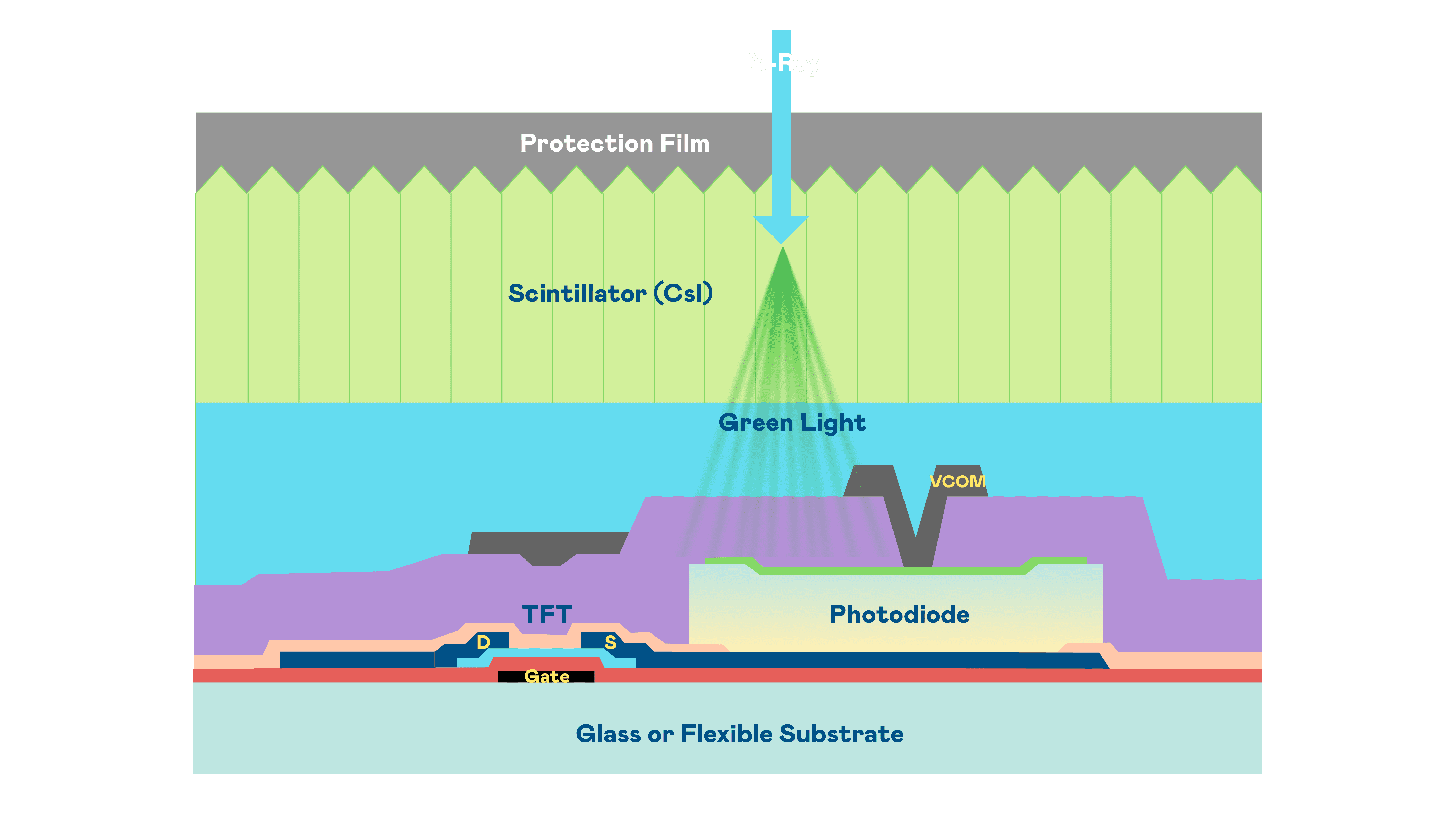 PA直营的X光影像感测阵列使用薄膜电晶体 (TFT) 作为每个像素的读取开关,,,,搭配光电二极体(Photodiode)的光电转换元件,,,用以感测X光影像讯号。。